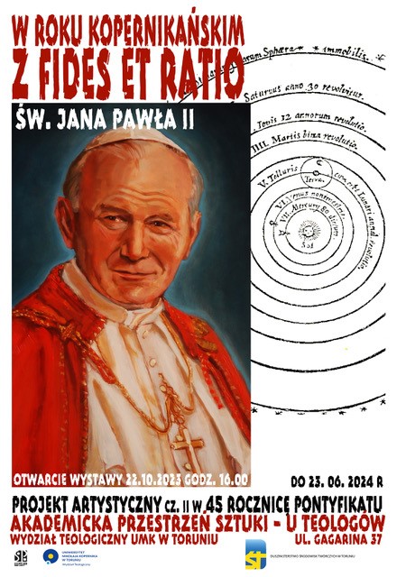 Na Wydziale Teologicznym UMK Duszpasterstwo Środowisk Twórczych im. św. Jana Pawła II w Toruniu, w ramach Akademickiej Przestrzeni Sztuki - U TEOLOGÓW, otworzyło wystawę zatytułowaną: W ROKU KOPERNIKAŃSKIM Z FIDES ET RATIO św. Jana Pawła II. Prezentowana w terminie 22.10.2023–23.06.2024 wystawa jest dedykowana Janowi Pawłowi II.
